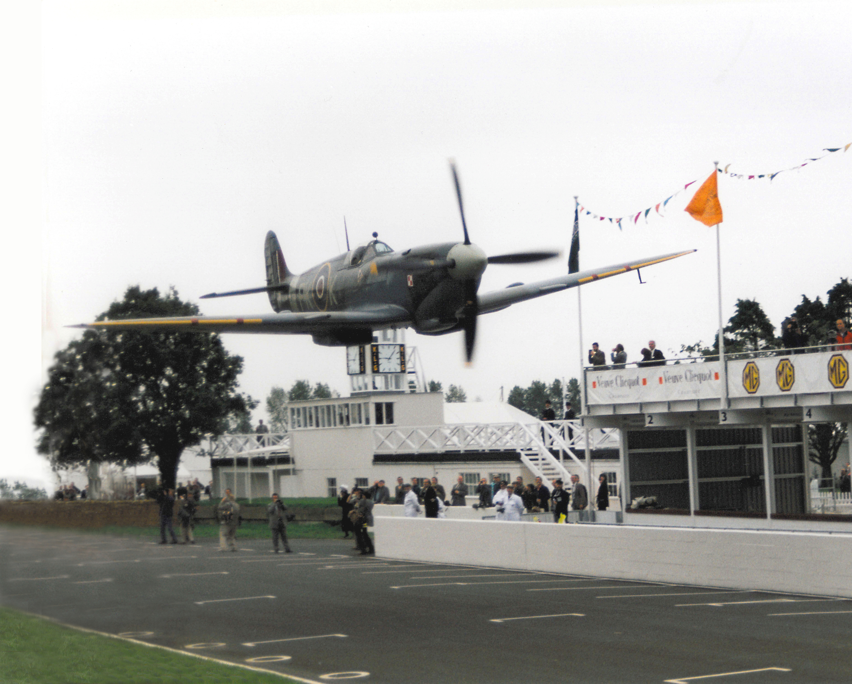 At the very first Goodwood Revival, Lord March wanted to open it in style......his idea was to drive his AC along the pit straight whilst the legendary Ray Hanna flew a Spitfire in the opposite direction, and cross above him over the start/finish line.......what followed went down in history.... ......Hanna got the Spit properly wound up in the clouds to the south of the circuit, and came in below and in between the flagpoles and the grandstand (from where the photo is taken) with the taps wide open....needless to say the sight and sound was absolutely stunning.....and Hanna got a massive bollicking from the CAA....but the crowd didn't care....and nor did Ray! Attachment: