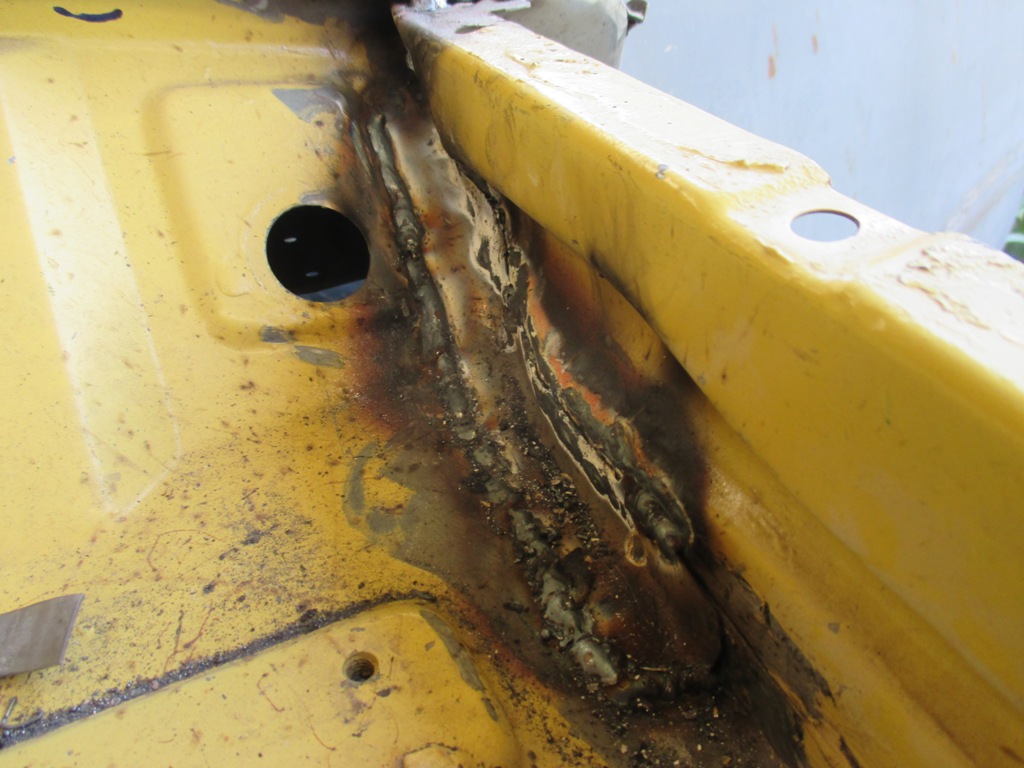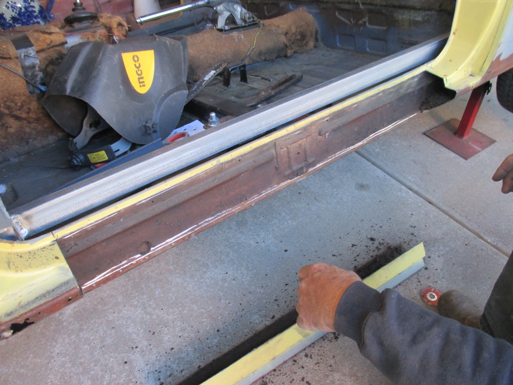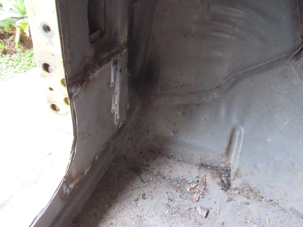 Today was the day to do the driver side sill. We welded in the sections of the A pillar on the passenger side and only the top hat section remains to be welded in after it had been fabricated. As we caulked all the sections of the new parts welded in we need to wait for that to dry before putting that on so that will happen next week. We believed the A Pillar on the driver side was not as bad as the passenger side, how wrong we were, you will see from the pictures that we had to take a large section out until we found good metal. this will be finished next week. The driver side sill is all fabricated and welded in including the back section so we are making good progress. During the A Pillar work we discovered more rust in the foot well on both sides, this is very minor and two new sections will be fabricated and welded in next week.