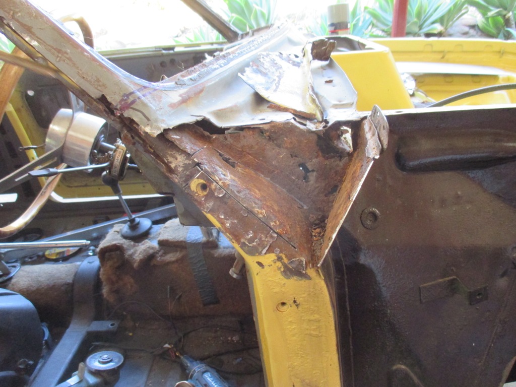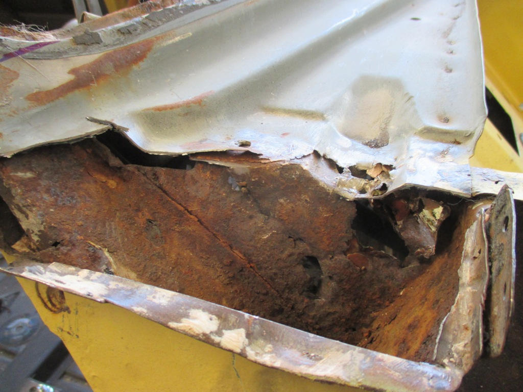 There appears to be more degeneration of the body at the front end so once we have completed the A Pillars it should be relatively easy going. You do not go into a restoration like this without your both eyes open so at this stage there have been no surprises and in fact the body is pretty good for its age. We knew the passenger side suspension tower had rust in it and it was hidden over with filler so it came as no surprise to find a hole when we started digging. What we did find provided a moment where we had a chuckle (when you see the picture you will understand) and I wonder what next this little car will offer up. It just keeps giving and is quite rewarding to work on. When you start digging into the bones of a car like we are you realise just how well these little jiggers were really built, they are very sound structurally it is just the metal was not treated at the time of production hence the rust issues.