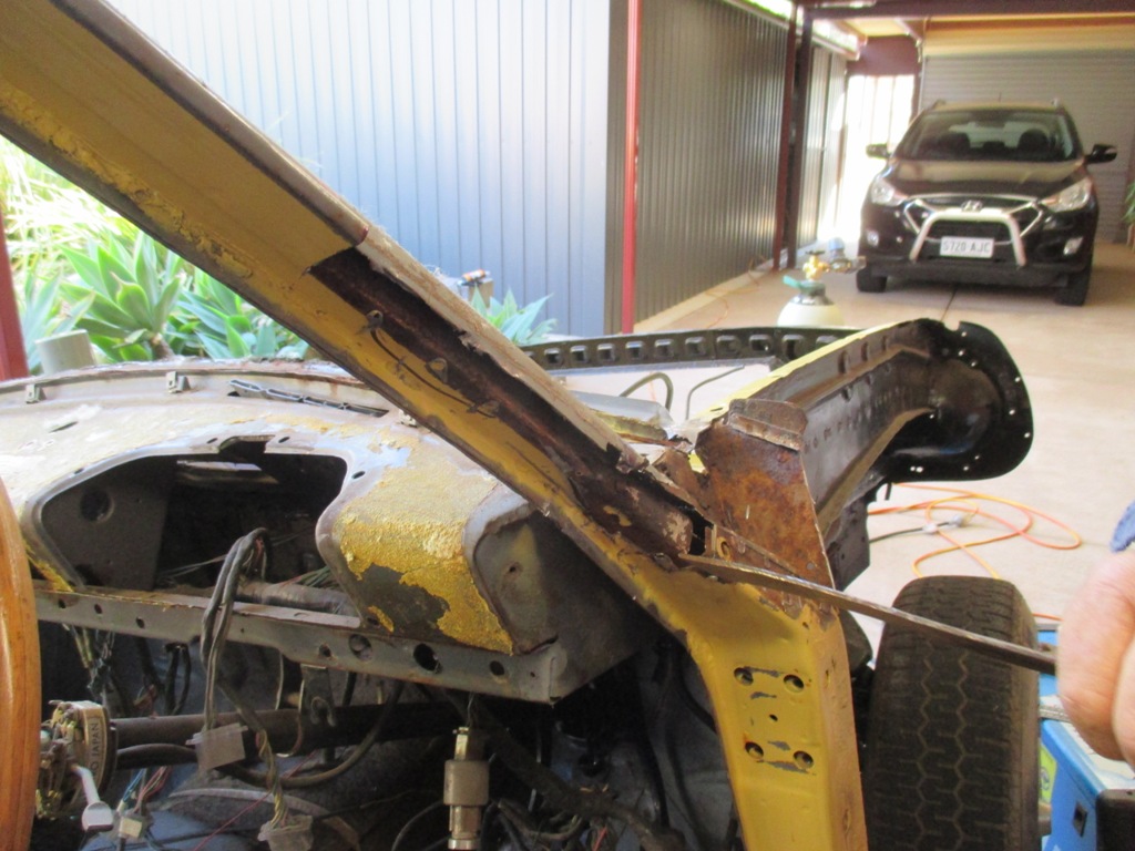 Hi Lewis, Thanks for your comments. Yes it will be solid but still a ways to go yet. Next week we hope to complete the passenger side rear quarter, that will take some time as we do not have a donor piece so it will have to be fabricated by hand but my panel beater is very good at that and if time permits we will try and complete the back tail light section and return that to how it should be. Once that is all completed then we have the gutter railing in the roof section on both sides, no rust originally evident there but with a little tapping we found it. Last major piece is the passenger side suspension tower but I will move it into the shed and up on the hoist for that as we will need to drop the front end out to get a clear go at it. Finally we will do the windscreen surrounds and any other little bits and pieces then work the panels along with guards, doors, bonnet and boot in preparation for painting. We hope to have it in colour by the end of the year or early next year then off to the trimmers whilst I try and source engine bits for my original G160 like pistons etc. I am enjoying this car and it is making me think outside the square so the old grey cells are getting a good work out.