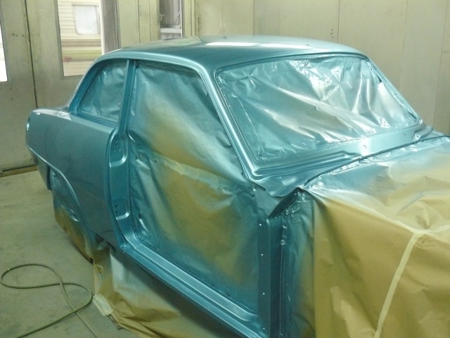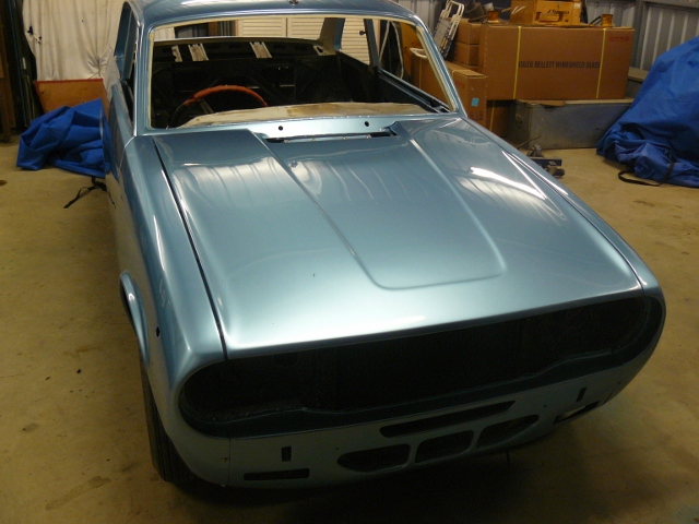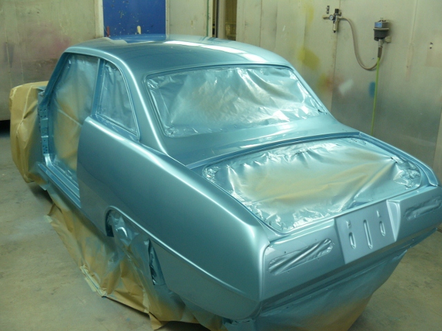 Patches was painted today  the outside is a little lighter than the engine bay as there was no pearl used in the engine bay. It was a overcast day today and when i took the photos it was under the booth lights,It has a strong silver pearl and shows up grey/silver colour when its close to a sky blue  at i hope it will