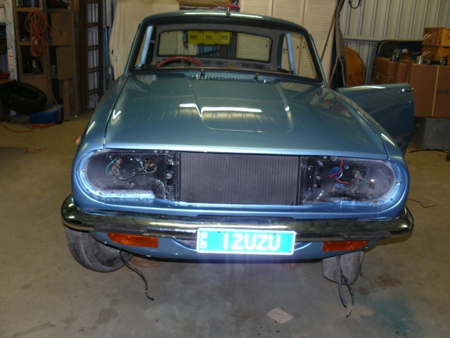 fitted the headlight today patches has not got the late model headlight sarounds so i had to make brackets to fit the late grill. This grills is ol yella's so i will remove it now brackets are made. All front electrical work is complete just needs a little tidy up. I had to take a truck to brissie today so droped into the rubber shop and got weather strips and a few bits and completed the bits i did not have. This car has been a long drawn out project but during this time we have imported parts ex japan to do it as best we can. All the outer bits have been redone or new and stored so i will complete the outside fit the new dash and console when the cab is sealed,front and rear windows are in and 1 rear quarter window is fitted. Hoodlining is done i have had a change of heart with the interior so patches seats will go into ol yella so patches might have to wait a little while as ol yella needs funding while the guy's can work on it.
