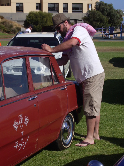 I also added some Japanese writing on the door. Not know what to write, I put "Ginza Province Isuzu Taxi" into Google Translate, then put the result into WordArt, then sent it off to my signwriter mate, stuck it all on, peeled it off and got EXACTLY the desire effect! I overheard an old farmer musing about it at the rural Cavalcade of Cars in Kadina "Must've been some kind of Hong Kong taxi!!!" Close, old fella. Attachment:
