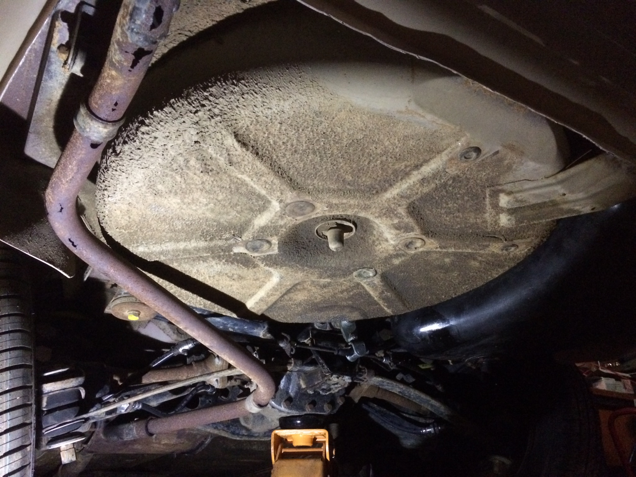 Thanks for the pics, now I have much better overview of the pipes. There is just a plain pipe from front to the under-back-seat pot? No resonator in the middle? Those racks I use to turn the car sideways are good. Simple but effective. It's much better to work with the bottom when the car is turned like this, I hate to work upwards. If you have a large jack, you can turn the car by yourself without having to worry about flipping over. Getting it back down is a bit more difficult, the easiest way is to use some help of 3-4 friends