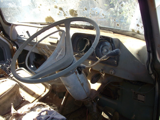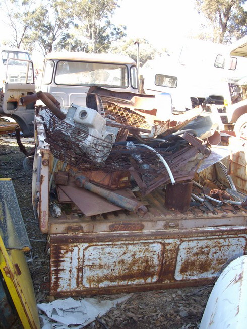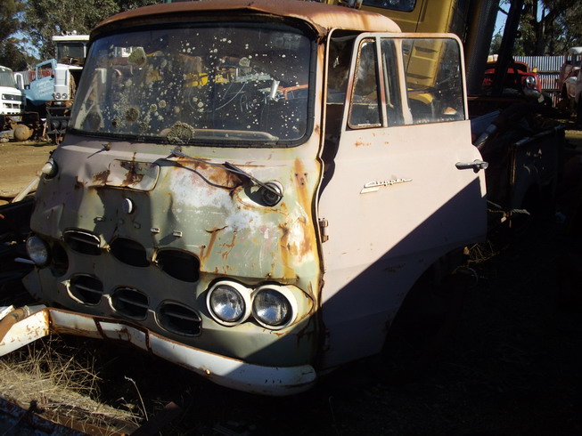 See, you never know what you might turn up 'till you post it on Bellett net. Nice day for a drive & a wander 'round a wrecking yard, & what turns up? 1 Super Clipper cabover - and it's a tub back O.K., it's a little pummelled, but it's mostly there - glass, badges, seat frame, motor, gearbox, diff - even the factory toolbox, mounted under the tray. All I noticed missing was the speedo, driver's headlight ring, the wheels (6 stud), and both front stub axles (oxyed-off for a trailer). It's a beam axle, though, and the steering gear is intact, so should be able to be substituted. It's a column manual with the shifter on the right-hand side of the wheel! Driver's door shuts o.k., but passenger one doesn't quite - lower hinge must be pushed back slightly. The only rust I found is around that hinge. Floors sound, even the tub (what I could see - lotsa junk). Some photos - more to follow in next post.