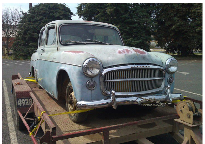 Again, not mine but belonging to the same friend as the last one.. This is a MkVIII Hillman Minx, made by Isuzu as the PH13. This was the first Hillman to have the OHV engine which looks so familiar to Bellett owners, the ancestor of the Bellett engine. This one has been saved from the crusher twice now. In 2009 someone rang me from Tumut about this car which had been sitting in a shed for several years. I posted a message about it in the Hillman yahoogroup and heard no more. Unknown to me someone from Canberra went and saved it. Then a few months ago he decided he would never get around to fixing it and was losing the storage for it so it had to go. Eventually my friend in Victoria decided she liked it and it was duly collected. It will need a much more extensive resto than the other one, but the engine still runs, the body is solid and interior should scrub up OK.