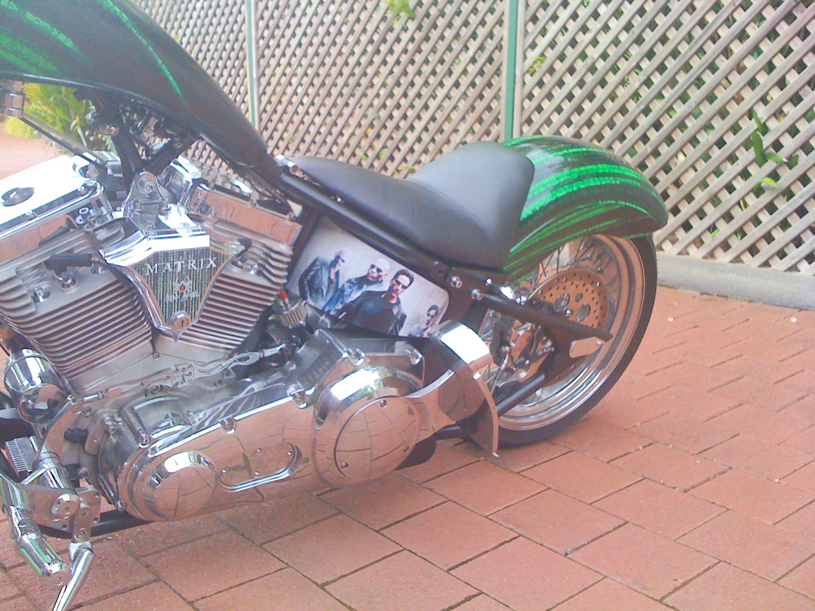 Here is the finished product - the Matrix graphics were temporary stickers on the undercoat so the bike looked okay to ride around Tassie for 5 weeks - it seemed to work too. We rode the bikes off the Ferry and went to a local Scottish Breakfast House (Maccas - spew) and a bkike magazine photographer spotted it and wanted to do a feature on it and handed me his business card......that was within 15mins landing in Tasmania - whew.