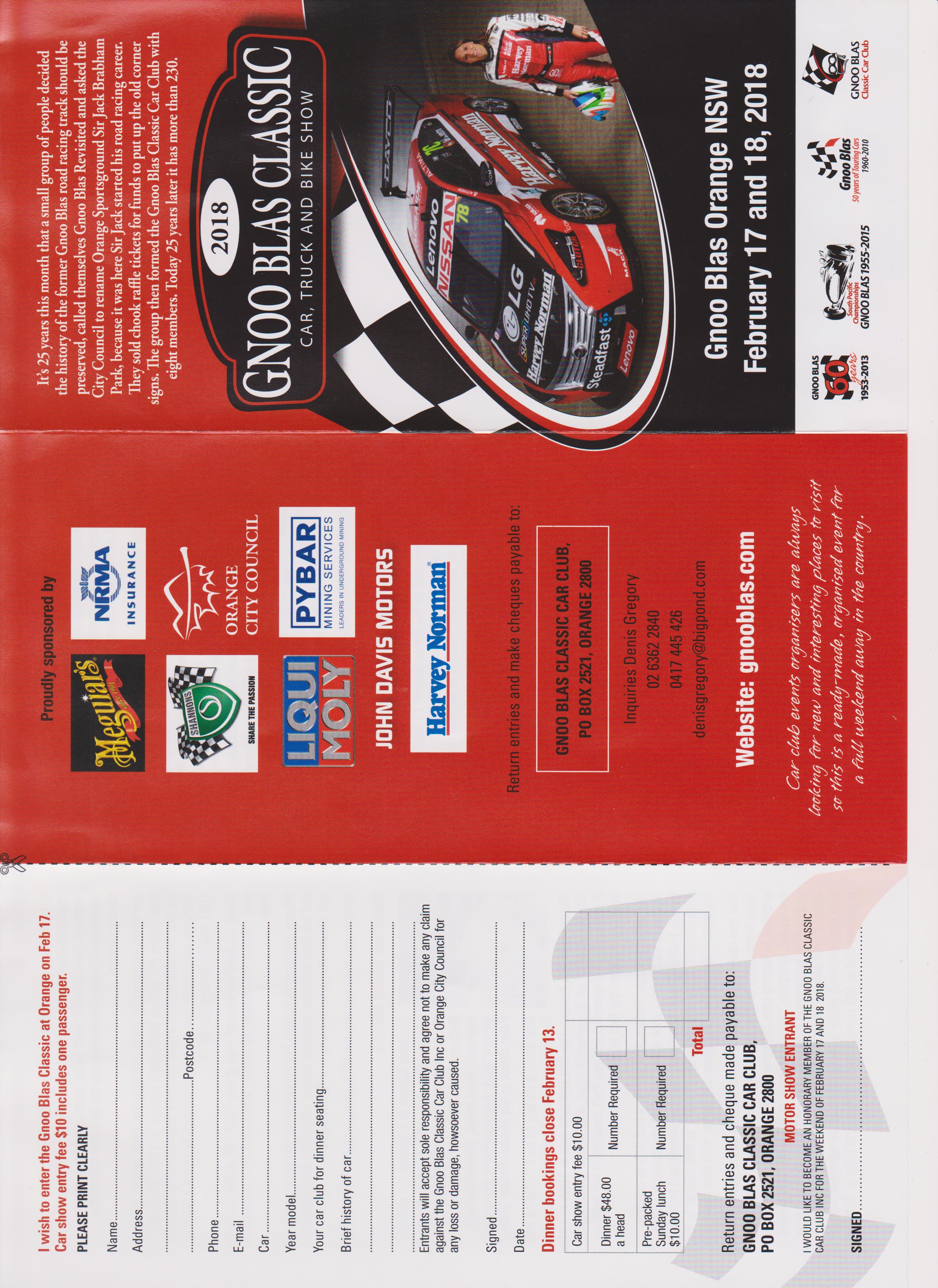 Please find attached the new Entry Form for the Gnoo Blas Classic Car Show 2018. Same place, Jack Brabham Park South Orange. If you enter now, it will save a lot of time at the entry gate on the day to get in.