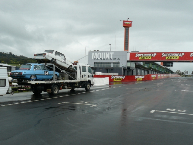 We left home on the 24th to find the road was closed behind us due to flooding but we were onroute to nsw and the sun was shining. The first weekend we spent in port macquarie monday we went to newcastle it was a little cloudy tuesday mudgee a weather warning was on the radio for 100mm for the next 3 days with the stars out that night 3 days is ok it will be gone by the weekend  wednesday we head for bathurst max temp 13 deg and it poored rain 3km's out of town and this was the last of the sun for us  being assured that the event will run no matter what we camped and tried to look tuff on the hill  The Grice family showed up for support on thursday. They were staying no matter what and ma and pa were in mudgee that night alls wet and cold but good a few drinks will make things better Fridy morning arrives with the officials to say if you want to get out of bathurst go the hiway is about to close  so we pack up and head for orange and we leave the Grices to travel in seach of sun but they tell us they only found more water and deeper,we sent ma and pa the message and have not seen them since  . We were accepted in the grafton hill climb the sun was out and we were off looking forward to getting dry 900km,s later we get to grafton windscreen wipers doing overtime still  We spent sunday sliding round the track Lizzie manage to raise the crowd with a 360 demo  only to get home to the hiway being shut behind us as we are on the edge of a tropical low. Thanks for the support gricey's and ma and pa where ever you got too for the support  and laugh