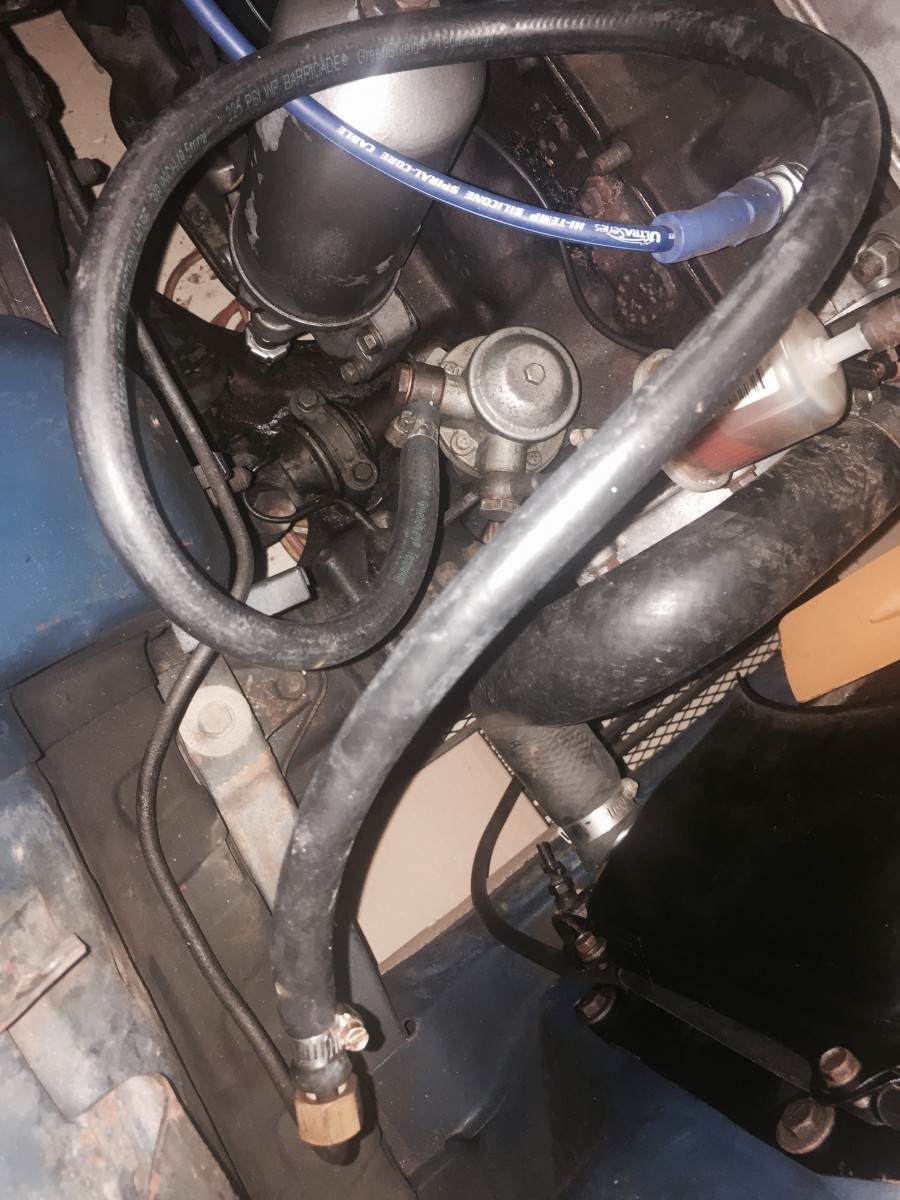 Hi Davo. Your configeration of the fuel hose is not correct. Normally the flter is before the pump. Not after as you have. The filter stops any grit getting into the valves in the pump and the carby. What you need is the steel line that goes from the pump, over the thermo. housing and to the carby. Use that filter that you have with shorter hoses. Not the "around the world" length that is there. You can carefully bend the fuel line coming from the tank to suit. Whatever happened to the original filter that you found a replacement element to go into from Supercheap.? If the fuel line that Lewis may be looking for is the 1 that you need and he cannot find. I may have 1 here to get you out of trouble.