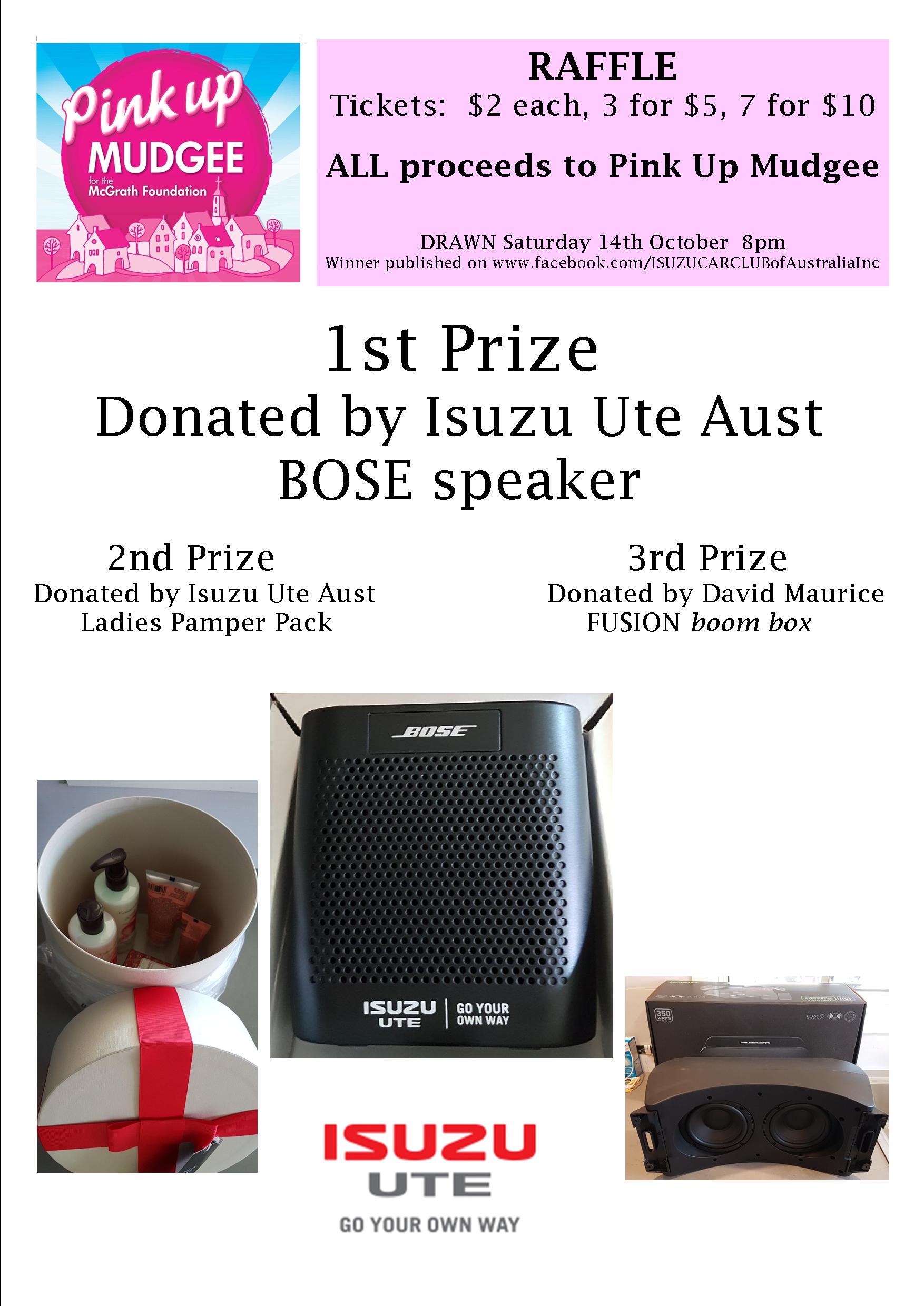 $460 was raised at the 2017 Nationals for "Pink Up Mudgee" (McGrath Foundation). CONGRATULATIONS and THANKS for everyone that bought tickets in the raffle. Prizes were supplied by Isuzu Ute Australia & David Maurice. 1st prize was won by Alan Cherry, 2nd prize Chloe & Graham Hadley, 3rd prize Greg & Liz Moller.
