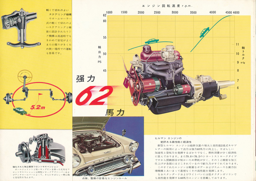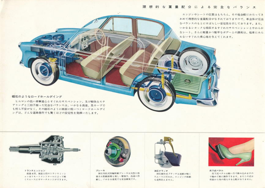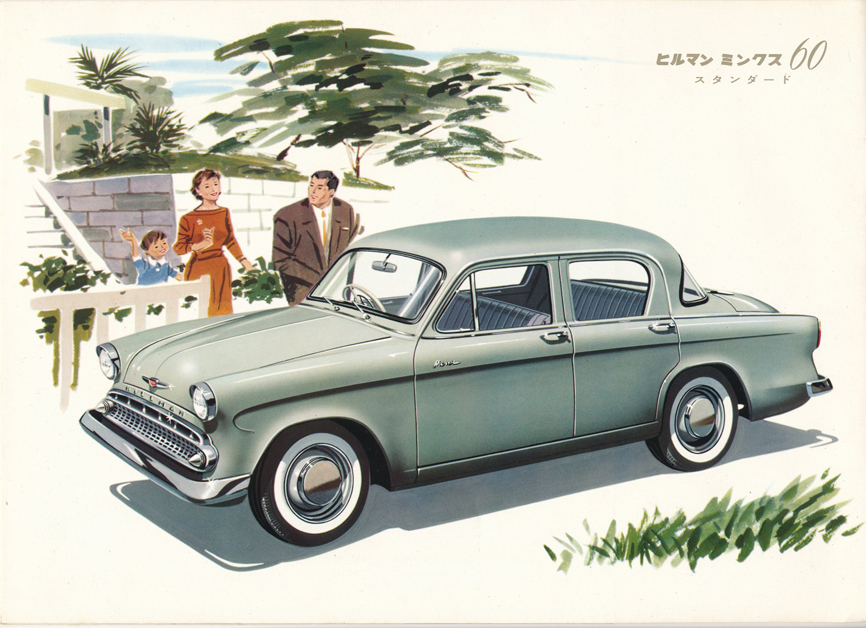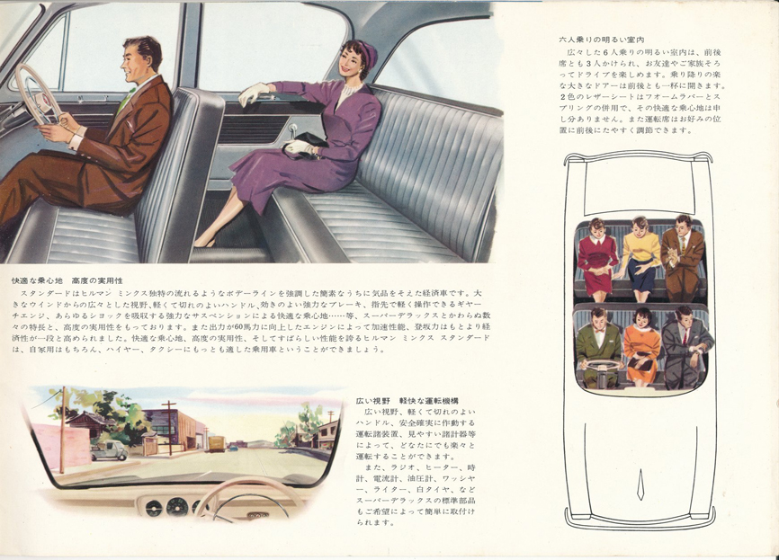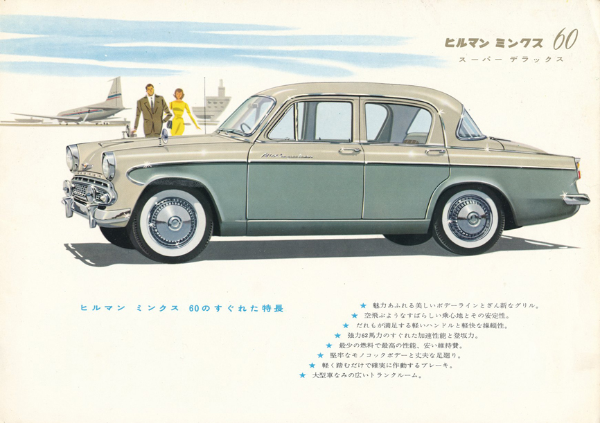 This makes an interesting contrast to the 1962 brochure I loaded earlier. This is very much a Rootes 1950s style brochure, using artwork instead of photography. I find this style delightful - of course it also allowed Rootes artists to draw really tiny people to make the cars look very spacious. Another interesting (to me) aspect is the side trim and two-tone painting used on the 1960 models. It is very much based on the early Sunbeam Rapier (but altered for 4 doors). Rootes in the UK never made a Minx with this side trim/paint style.