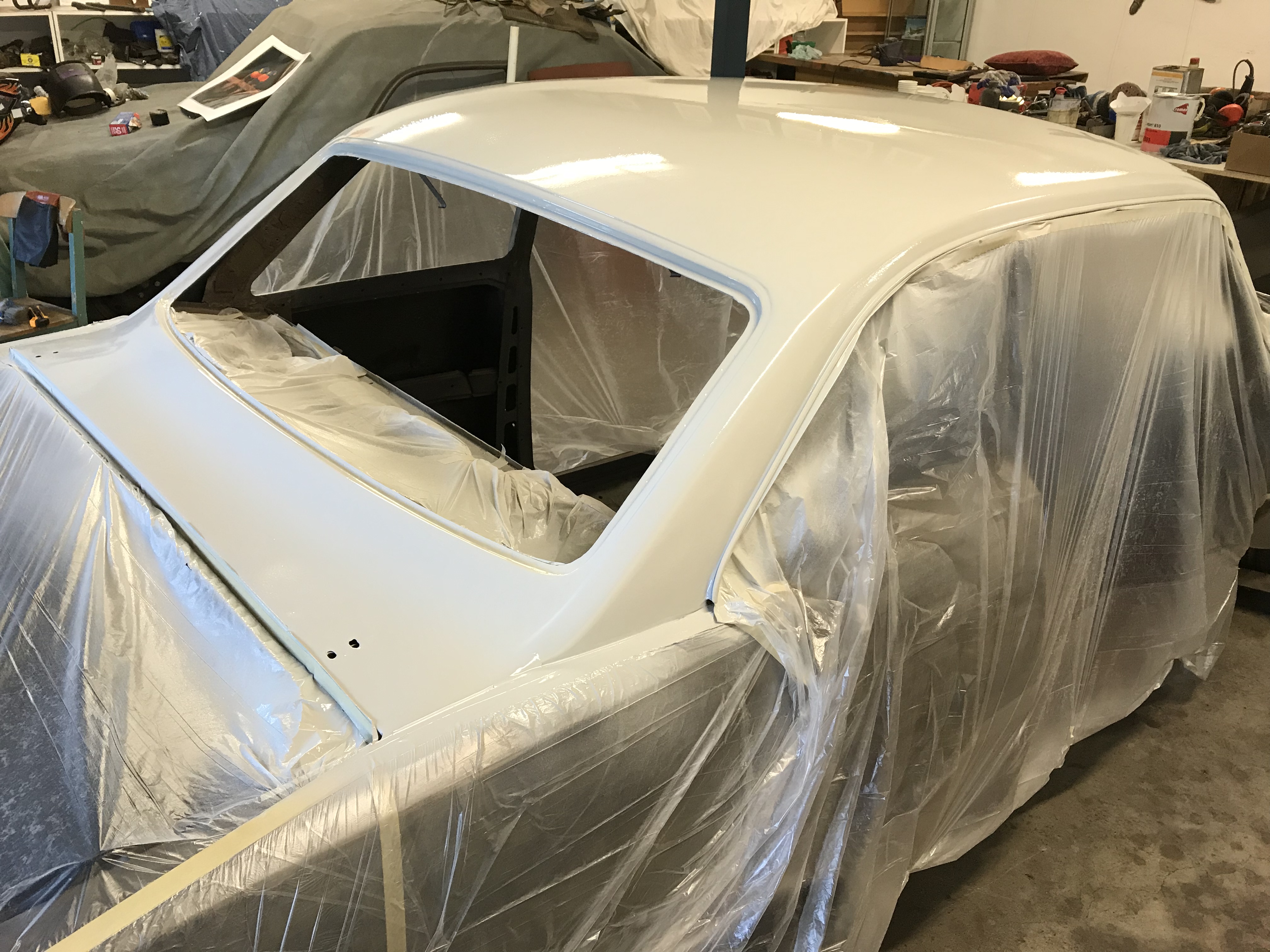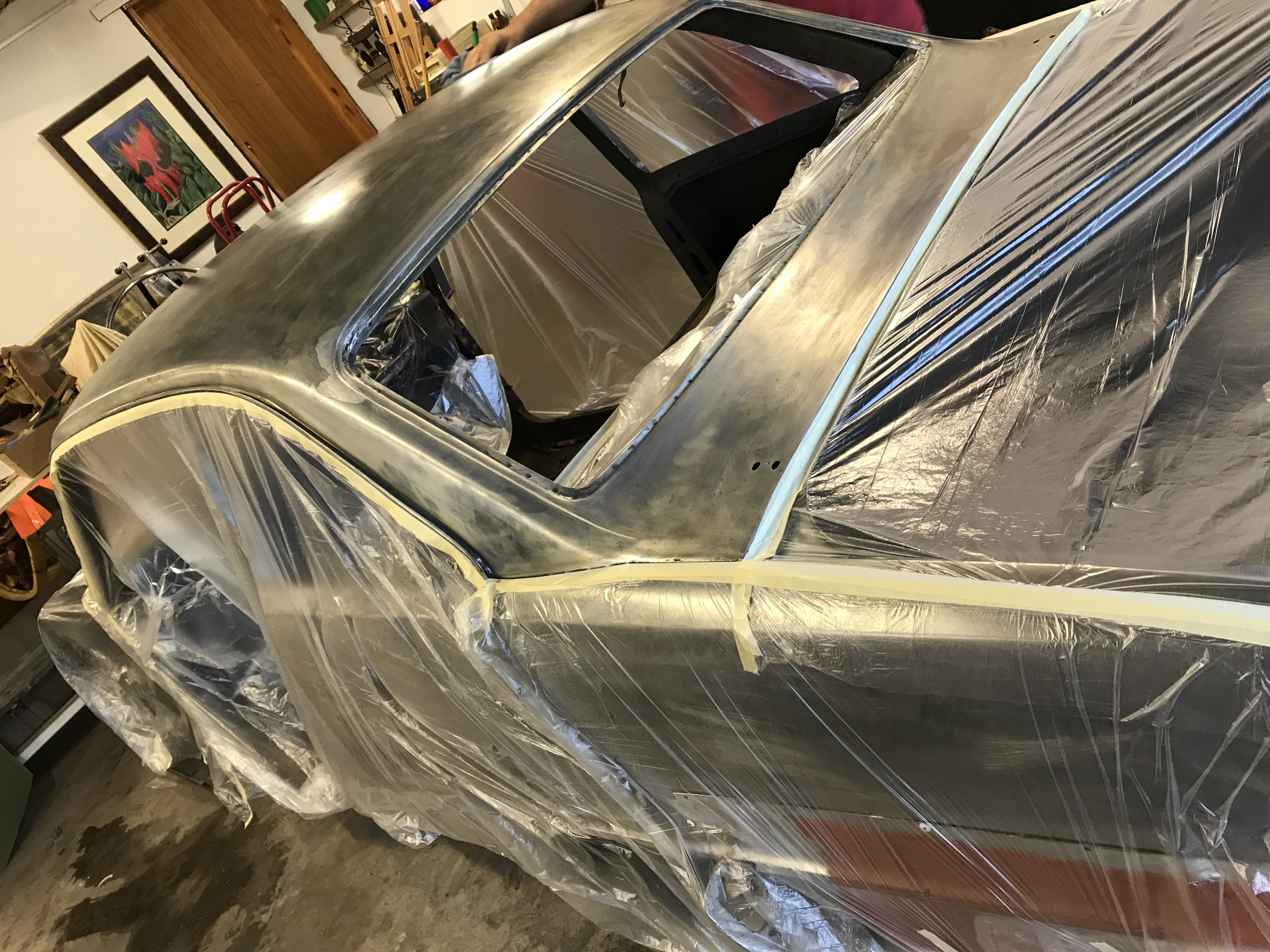 More rust found inside drivers rear quarter so rear panels not finished today. Roof rust removal finished and apoxy sealer sprayed on. Rear end will get welded together next week.
