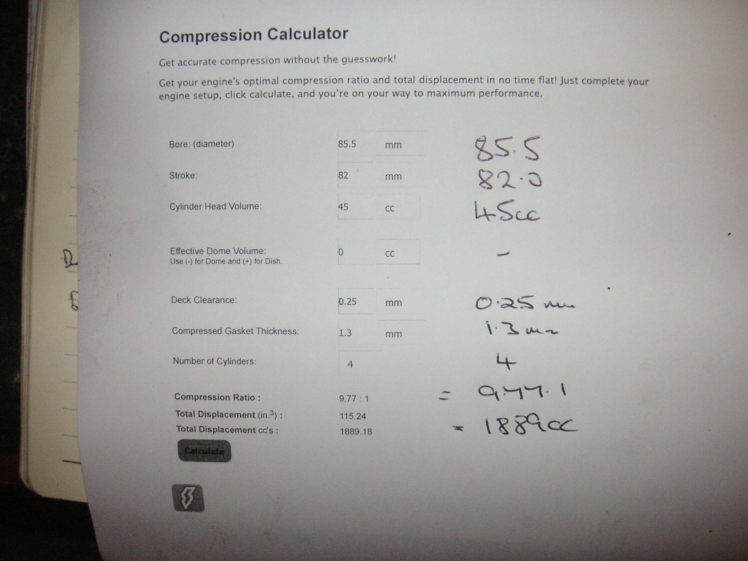 Pombellett wrote: Ha. It appears the figure you end up with depends on who's calculator you use....the only difference I can see between the two is that yours has a column for 'head gasket bore diameter' Fortunately we're only really concerned with how we compare with our last engine build, so we're safe as long as [url]we always use the same calculator.[/url]