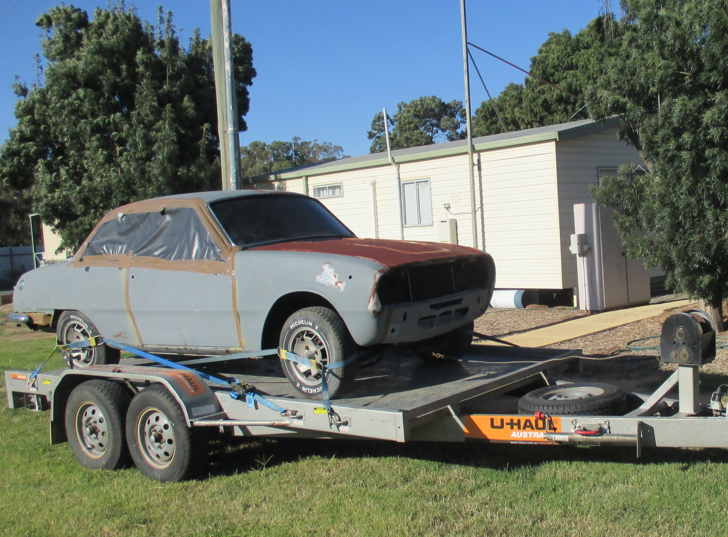 I introduced myself a couple of weeks ago seeking information about a GTR in Japan. One thing led to another and I now own the PR90 ex Davo Ex Dean. Dean was fantastic going above and beyond in bolting a lot of parts back on the car so it could be transported without having a car load of parts and spares all over the place. Thanks very much for your efforts Dean much appreciated. This now makes two PR90's in Adelaide undergoing restoration. I have made contact with Craig (Claws) and now I have the car at home will be catching up with him soon. We left Adelaide Sunday morning arriving at Deans at 9.00am Tuesday morning, loaded the car checked off my list and set off for Moree for that night. Wednesday blew a trailer tyre coming into Dubbo but Mr Bearepaires quickly fitted a new one to replace the spare and we were soon on our way arriving in Hay Wednesday night. Up early Thursday across that horrible Hay plain again arriving home around 2.00pm. Got spotted coming into Gawler by a couple of mates who happen to be my panel beater and spray painter. They followed me home and helped unload the car and gave it the once over, both gave the thumbs up remarking how straight the body was and that the rust repair work was nothing. I will add to this thread as things progress, I have to clear out my sons VL Calais which is finished except for the engine and gearbox installation then when that goes the GT can move onto the hoist. I expect to start in anger around April May and have given myself twelve months to completion barring any hiccups, the easiest part being the body which will not take long, the hardest being putting it back together and sourcing/ making hard to find bits like seals and rubbers. Dean has already posted pictures of the car loaded up at his place so I will include one here of us at the Hay Caravan Park. Cheers Peter