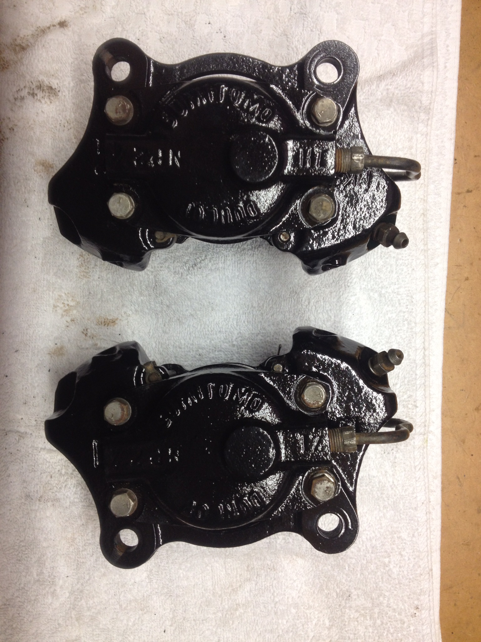I am trying to find out what calipers are on my GT. I saw where Davo mentioned that he had fitted a front brake conversion to his GT but I am not sure if these are the conversion ones or genuine GT. The ones that I have do not have any pads and my parts book does not show pictures of Disk brakes. The car came with a photo album that shows these calipers were rebuilt but I will get them checked out as they may have rusted up since the rebuild. I think I may have found some NOS pads for a GT but I have no idea what they look like or dimensions. I would appreciate it if somebody could identify these calipers from the pictures provided and also send me a picture of some front pads. Hopefully they are GT and the pads I have found will fit. Many thanks