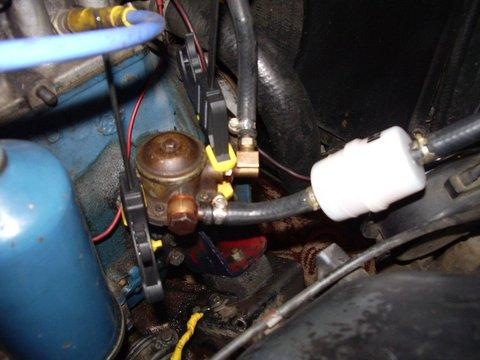 Note my tempory fix RAA style which kept her goin'. Two small adjusable clamps to compress the top and bottom halves of the fuel pump. At least 3 of the 5 screws holding them together had stripped. The inlet housing thread was partially stripped but had enough grip to pinch up tight with some brass washers, but still leaked a few drops after turning engine off.