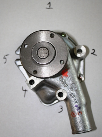This is a closer up of the original Bellett pump. One thing to note is that between holes 2 and 3 in the picture there is another hole. On my engine there is no bolt in that hole. I mention this because on the LUV pump (next picture) there is no hole there.