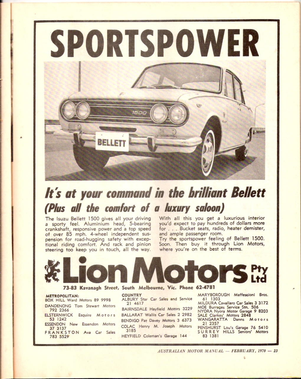 Very late article including Bellett (Bellett section only shown) and nice ad...mention of import restrictions pushing costs higher may shed some light of the demise of the car in Australia.