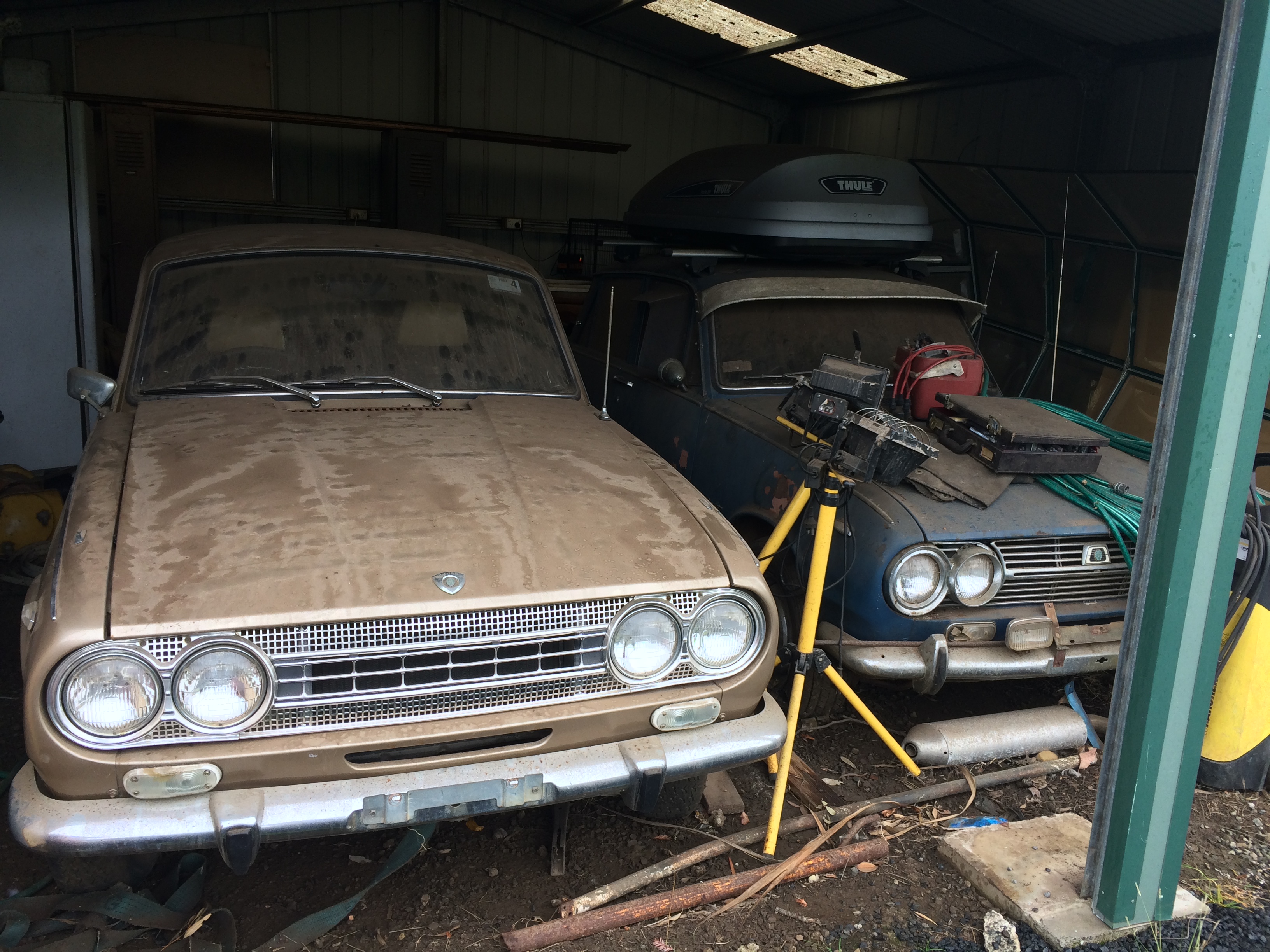 Greetings from the Apple Is One beautiful Gold '67 has mad an appearance plus a blue 66 'spares car' The Gold is a one owner with about 35k miles Engine turns by hand and can feel compression No rust rear quarters Straight panels Deluxe model 4 speed floor manual After market High back seats Could easily be a runner (last started 15 yrs ago and garaged/container/shed since) Small rat attack under bonnet and interior